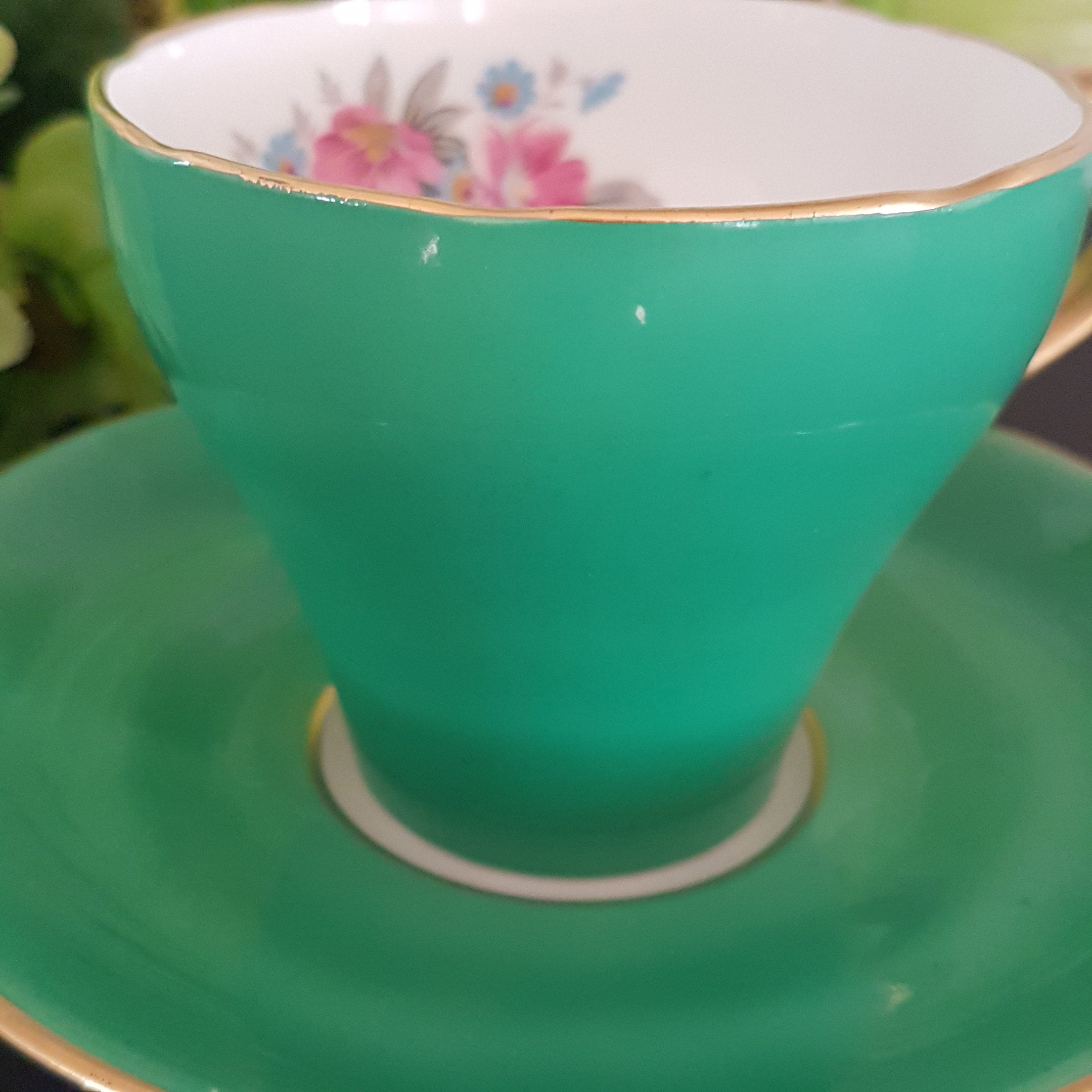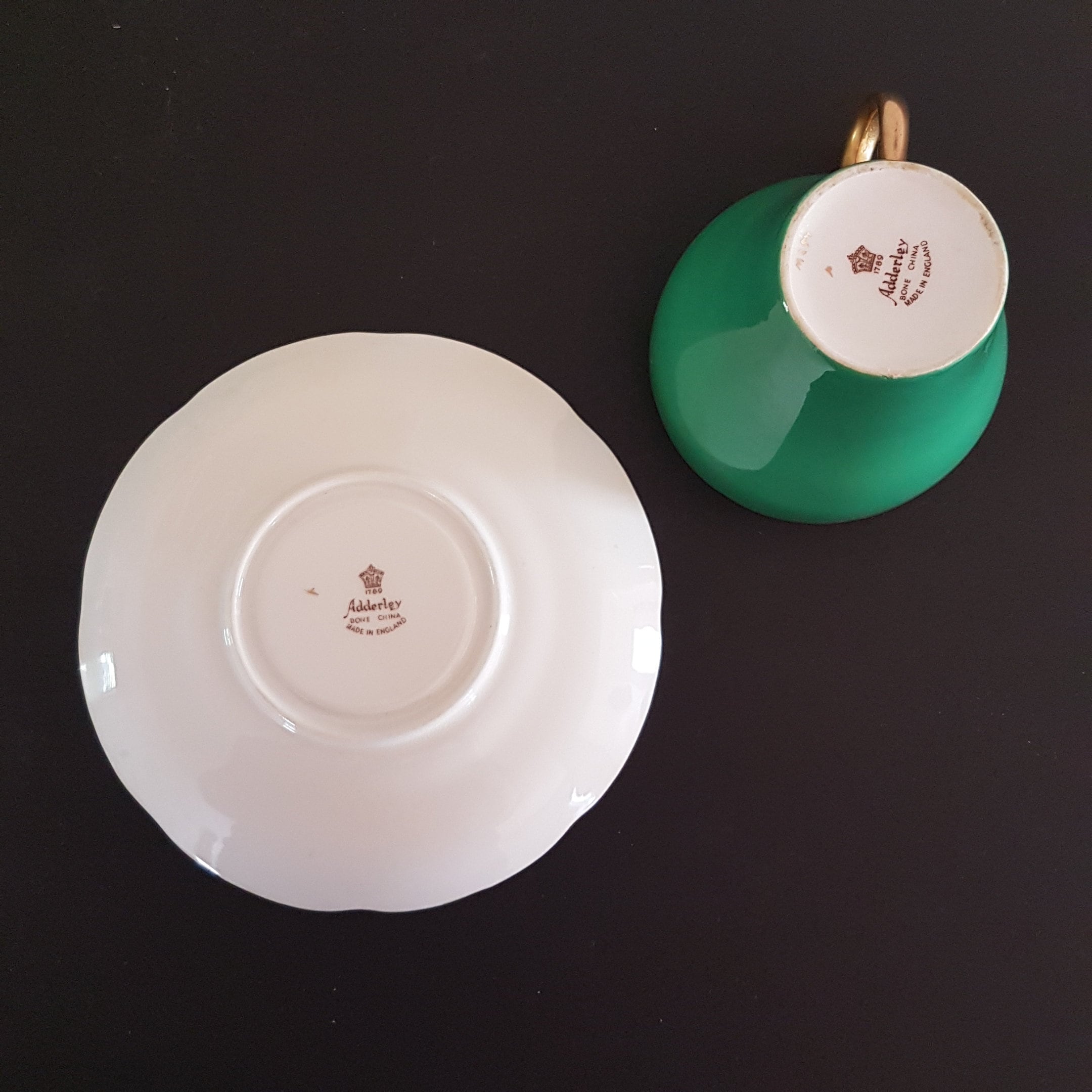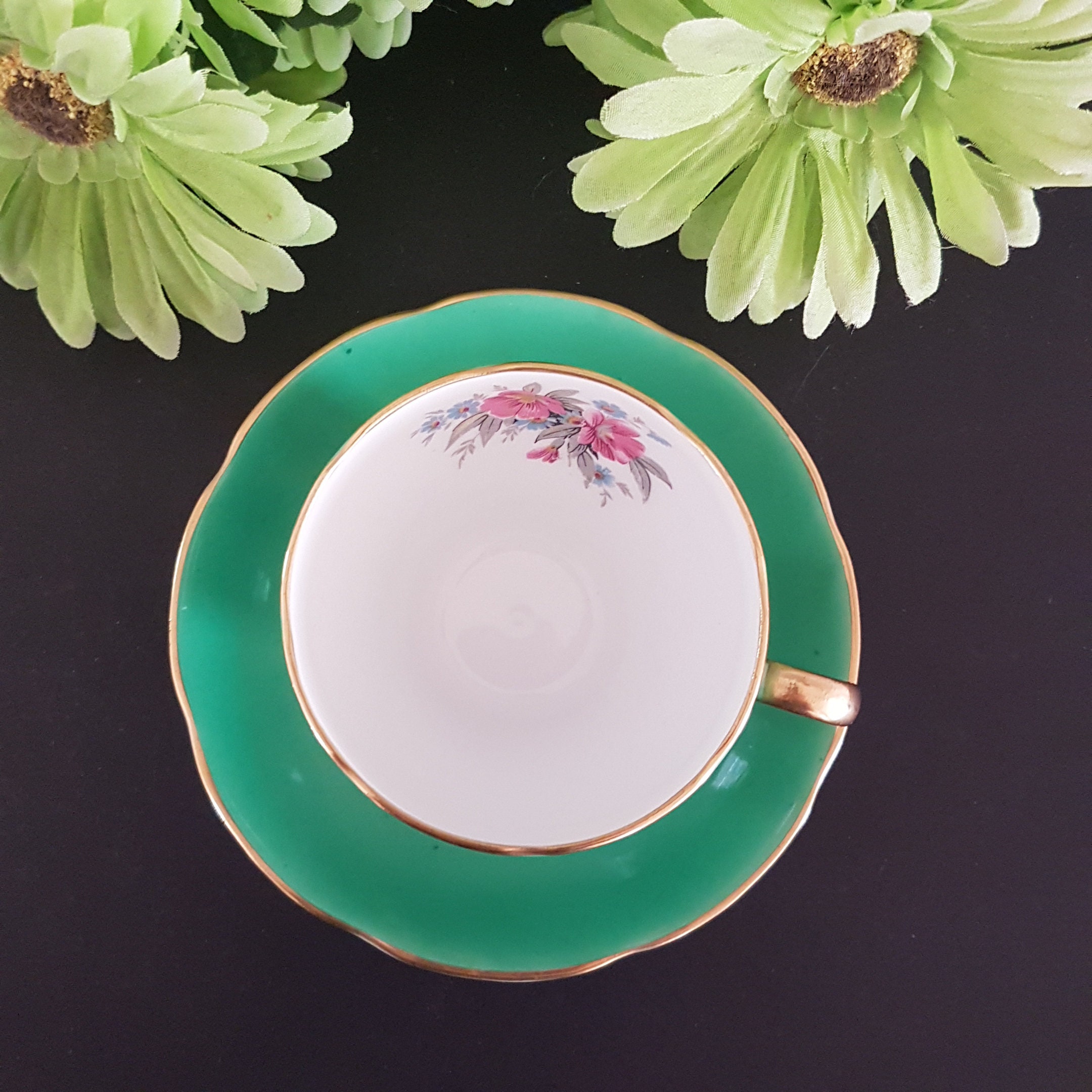 Vintage Adderley green tea cup and saucer set with pretty pink flowers and grey leaf bouquet inside tea cup. Gently scalloped gold trimmed edge on tea cup and saucer. Lovely gold gilt handle makes a bold statement against the green of the tea cup!