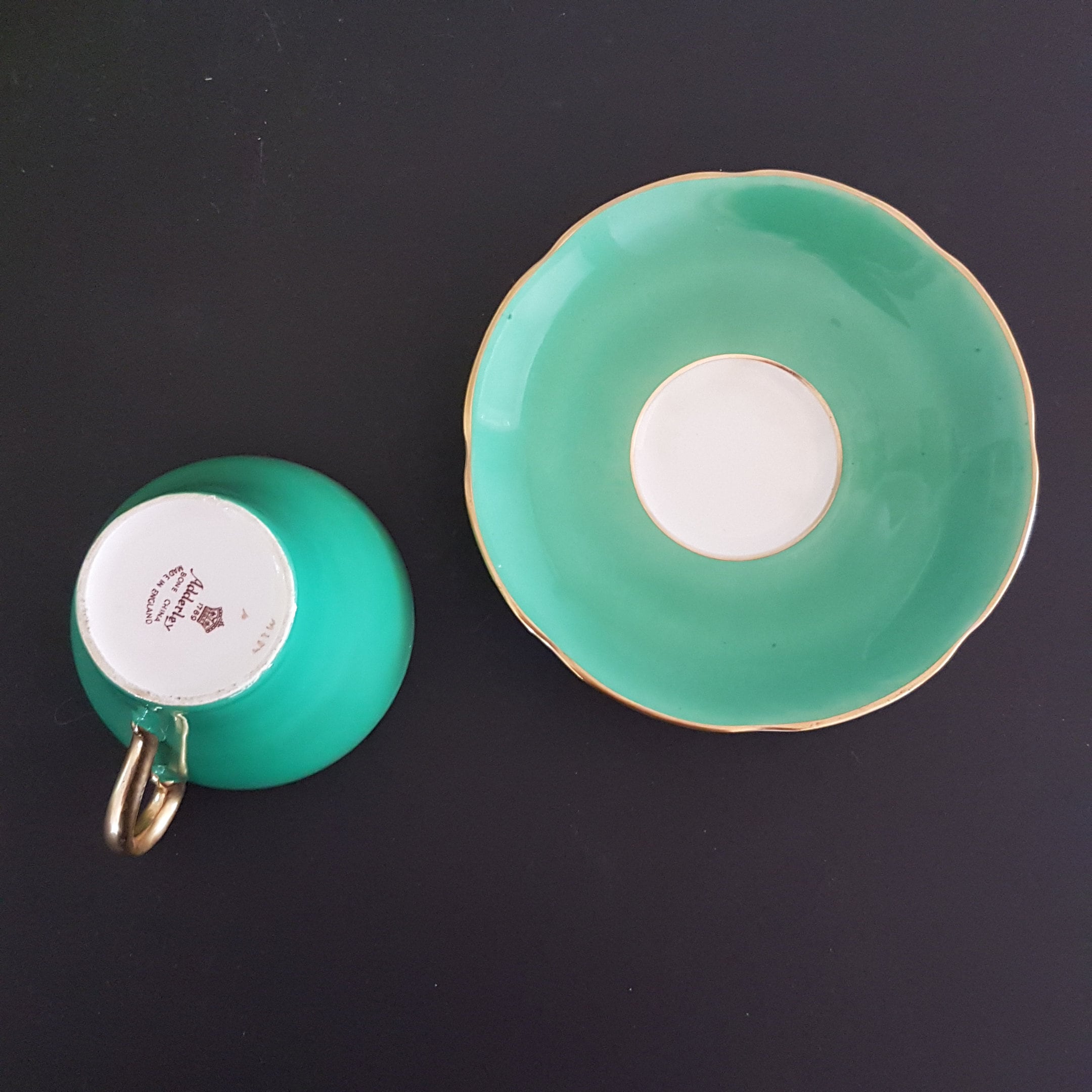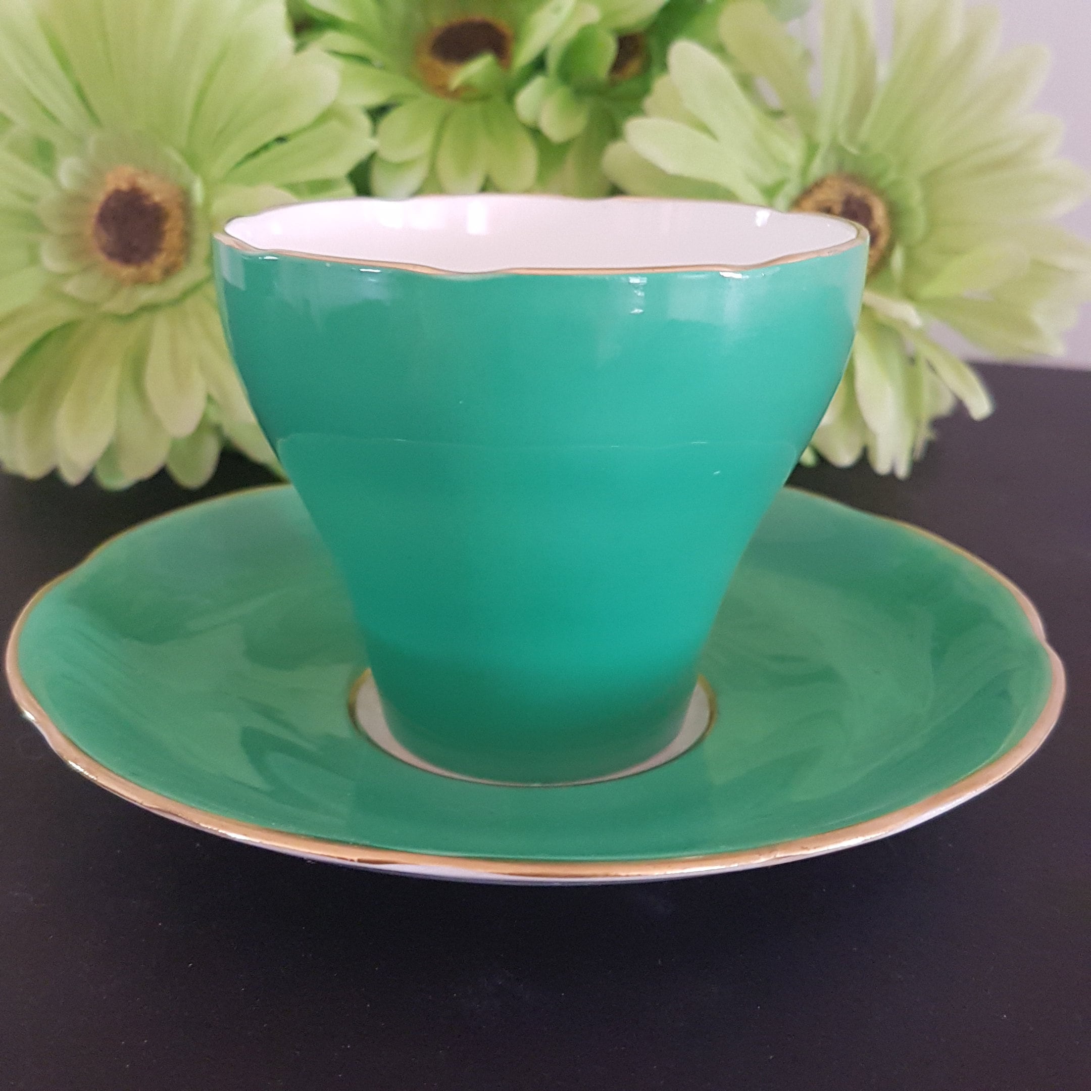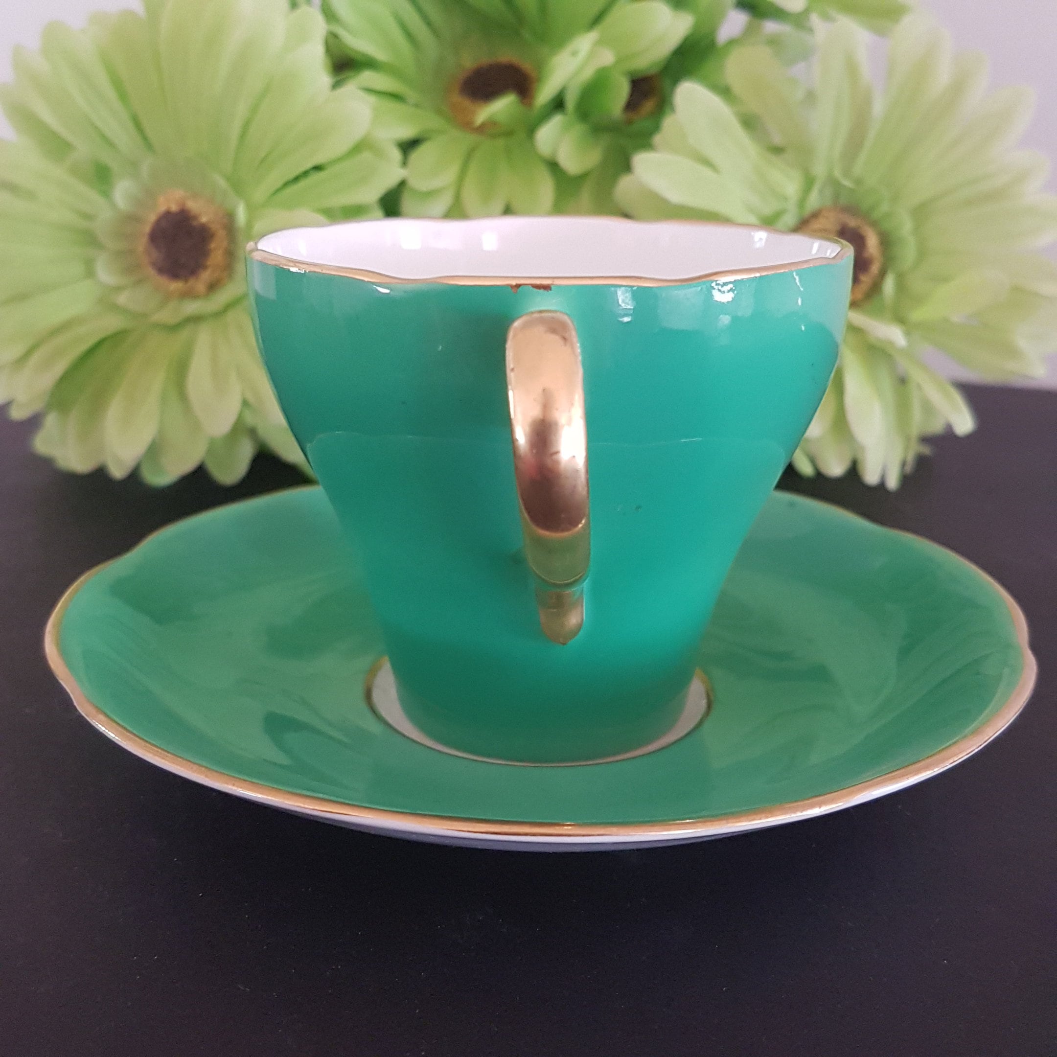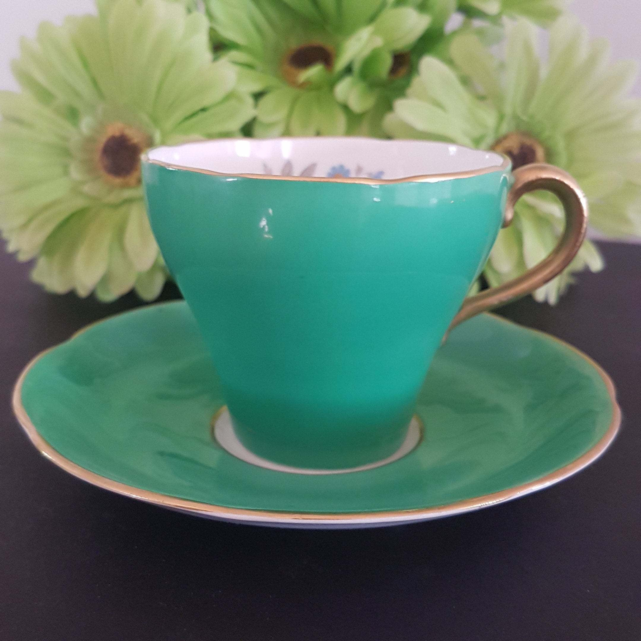 Vintage Adderley green tea cup and saucer set with pretty pink flowers and grey leaf bouquet inside tea cup. Gently scalloped gold trimmed edge on tea cup and saucer. Lovely gold gilt handle makes a bold statement against the green of the tea cup!