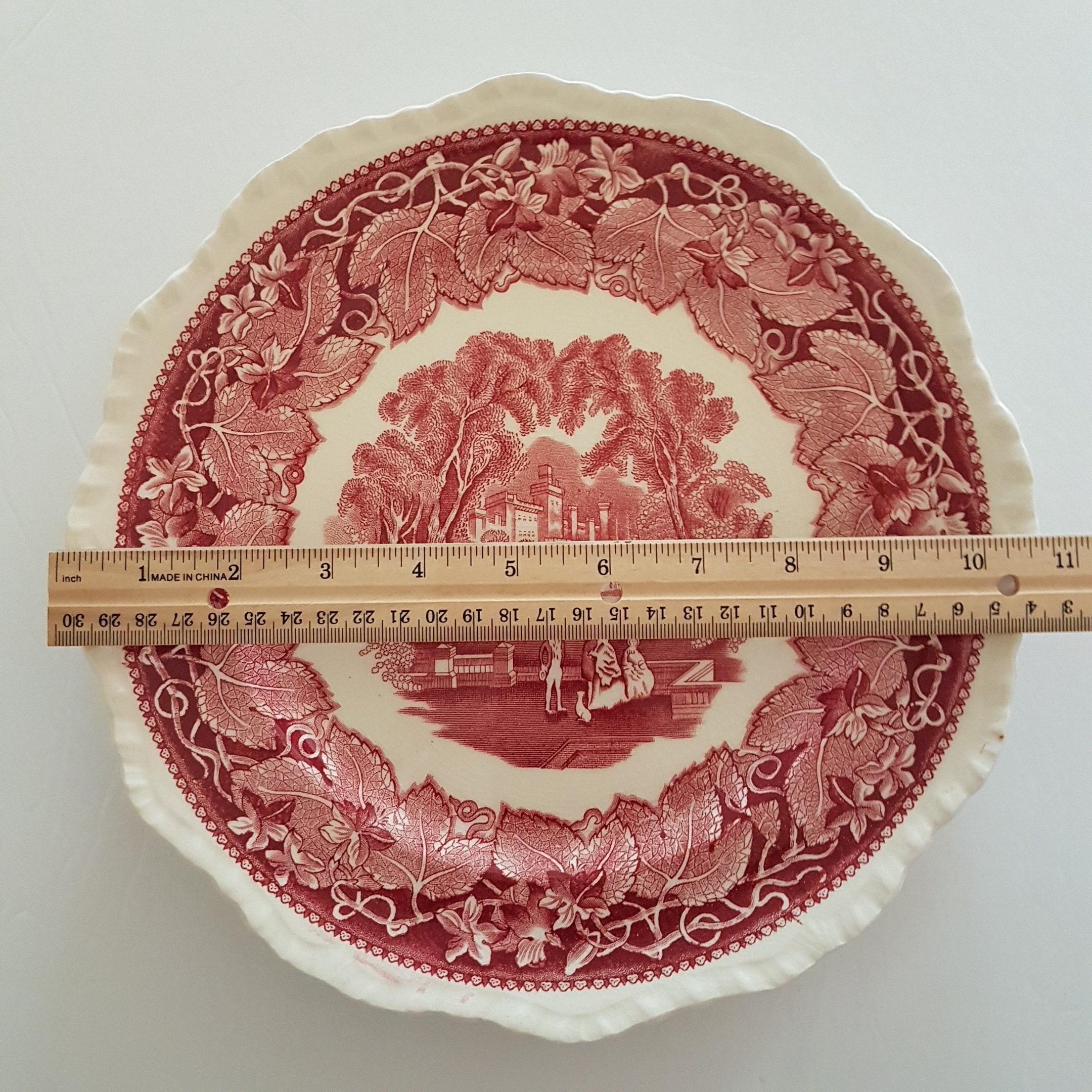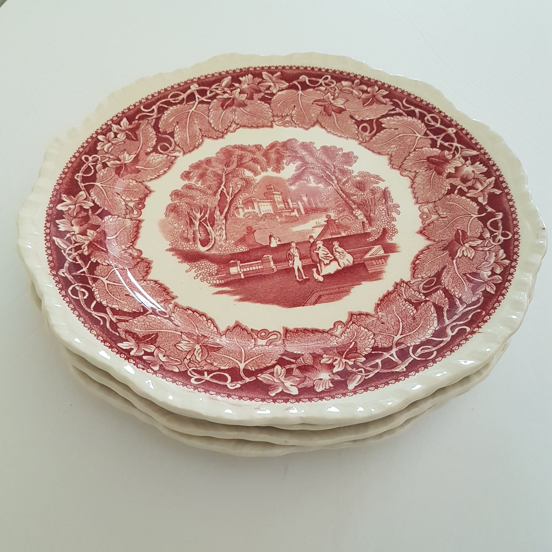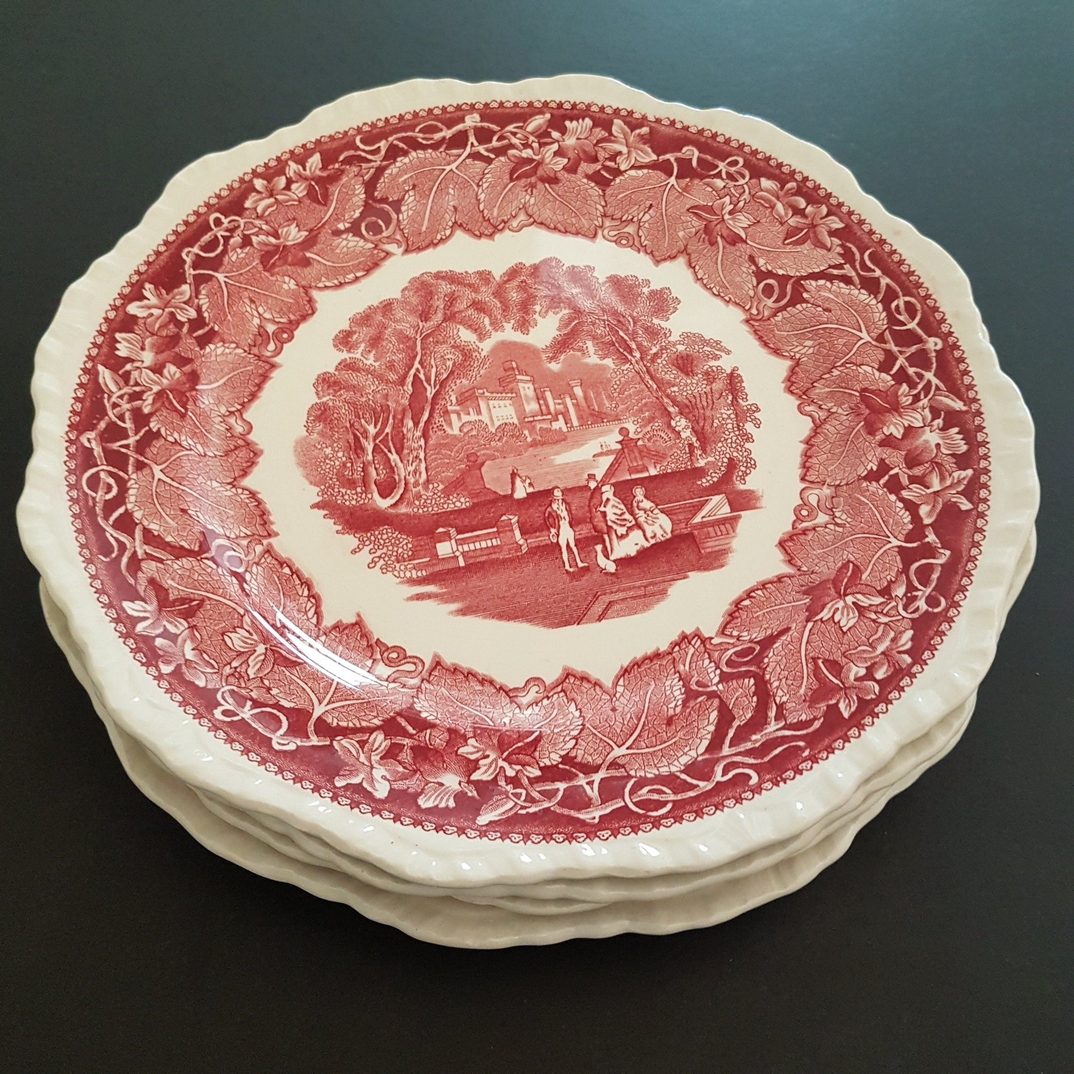 Red/pink transferware with Edwardian image of men and women in a courtyard with a castle in the background nestled in a forest. Large leaf border. Embossed edge. Red transfer on cream or off-white.
