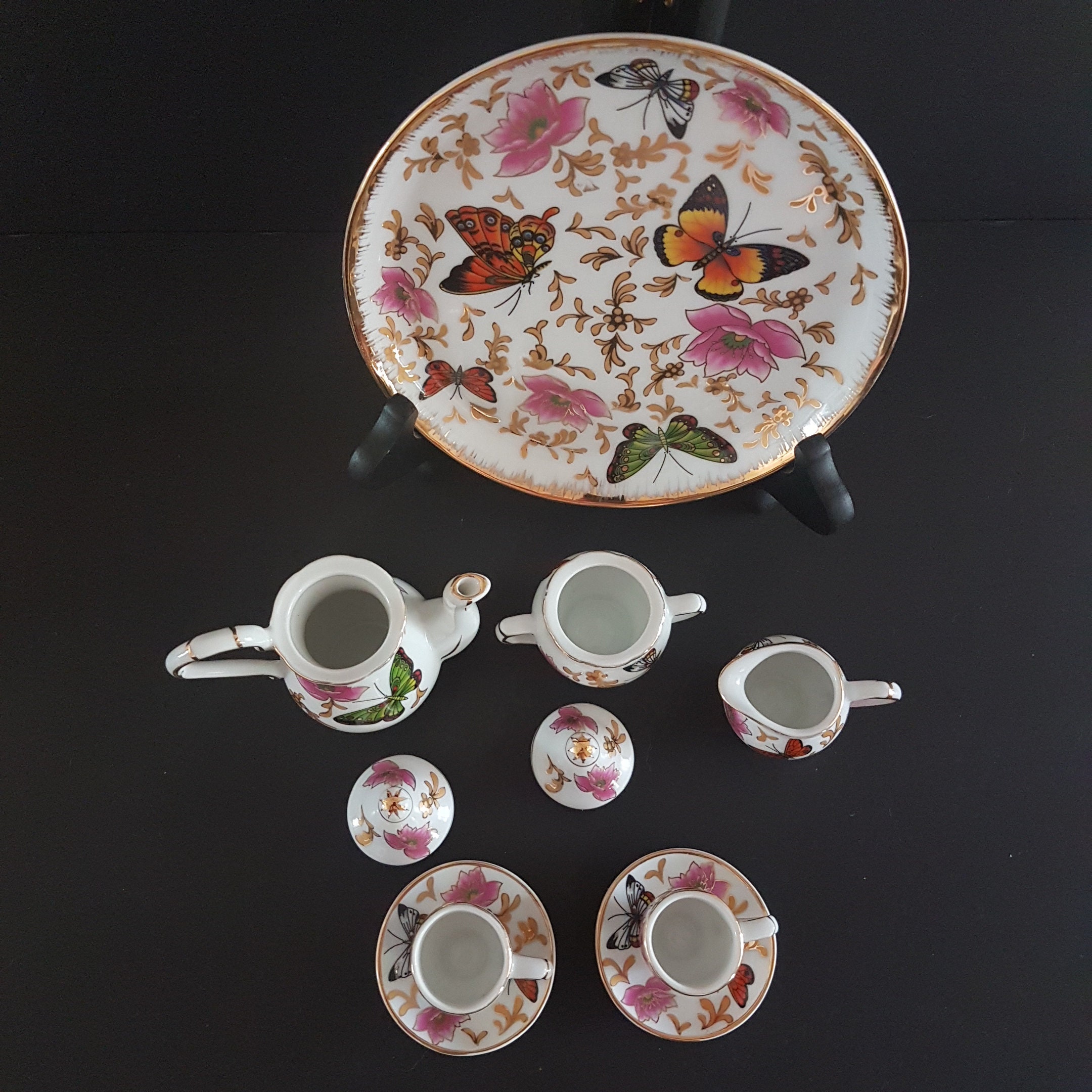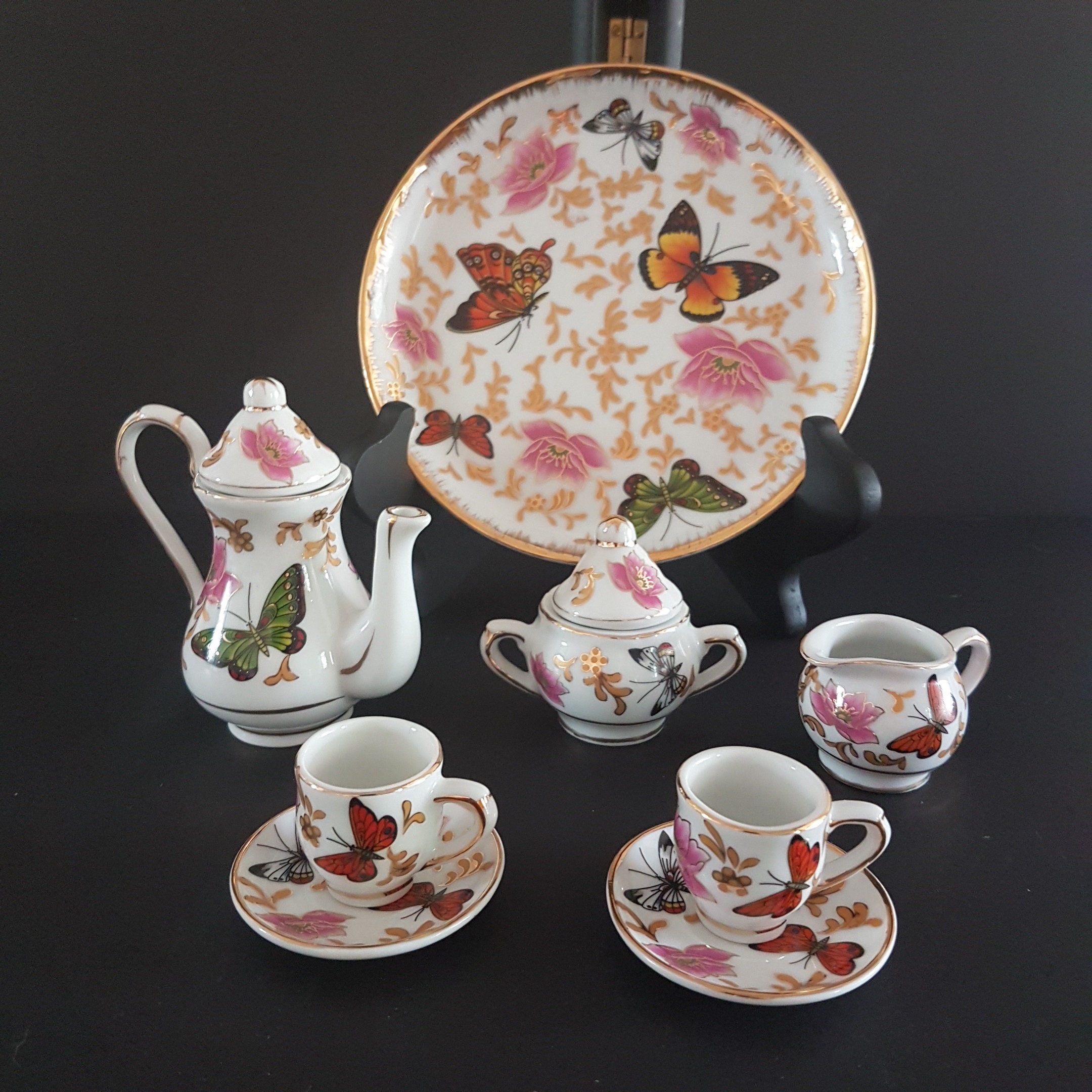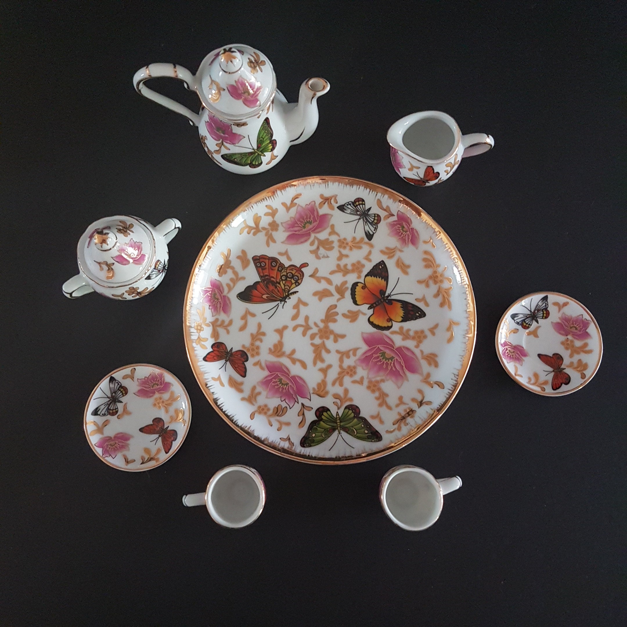 Beautiful green, orange and yellow finely detailed butterflies, big pink orchid-like flowers and lots of shimmery gold gild accents and gold trim on this BUTTERFLY miniature tea set with tray by Allison L.L.