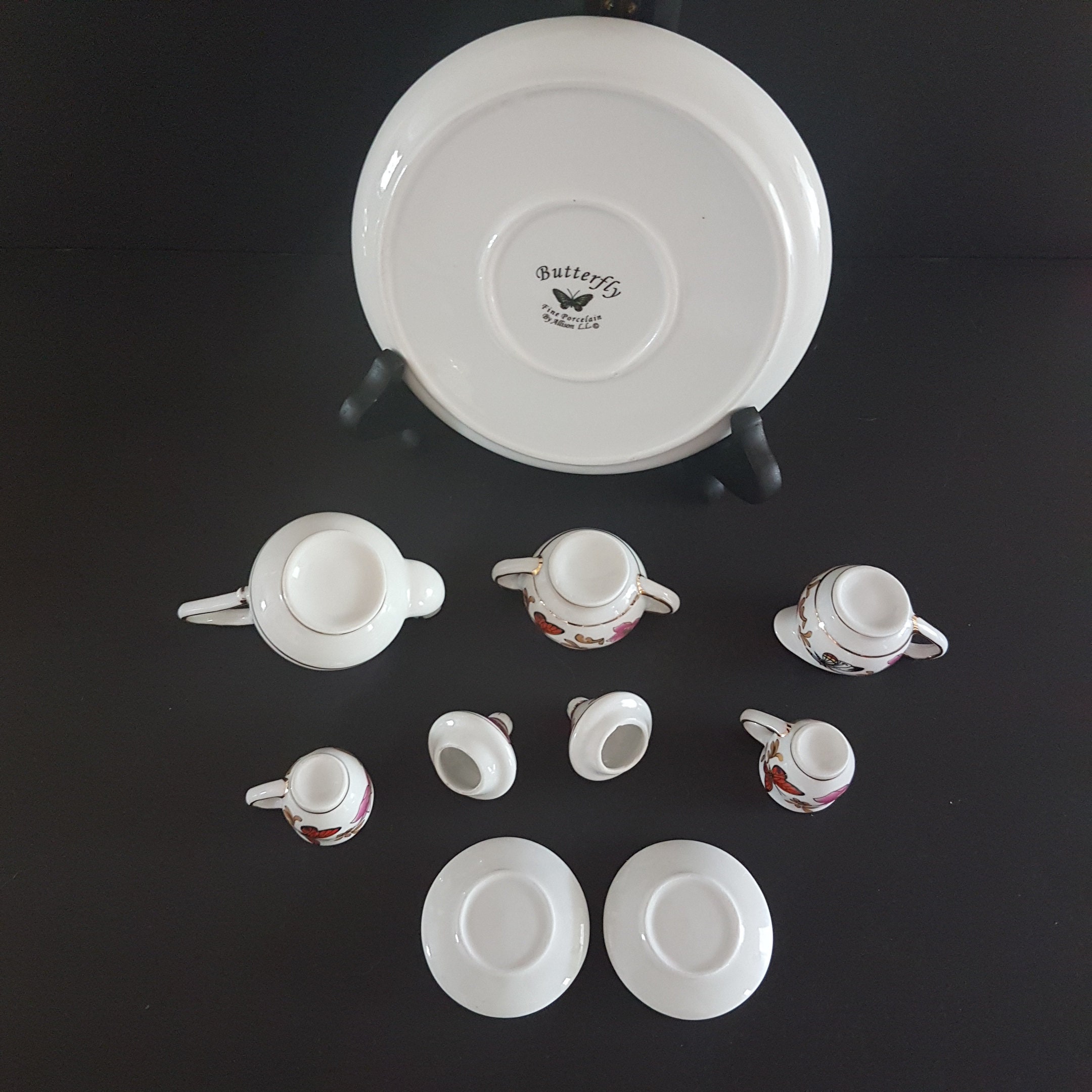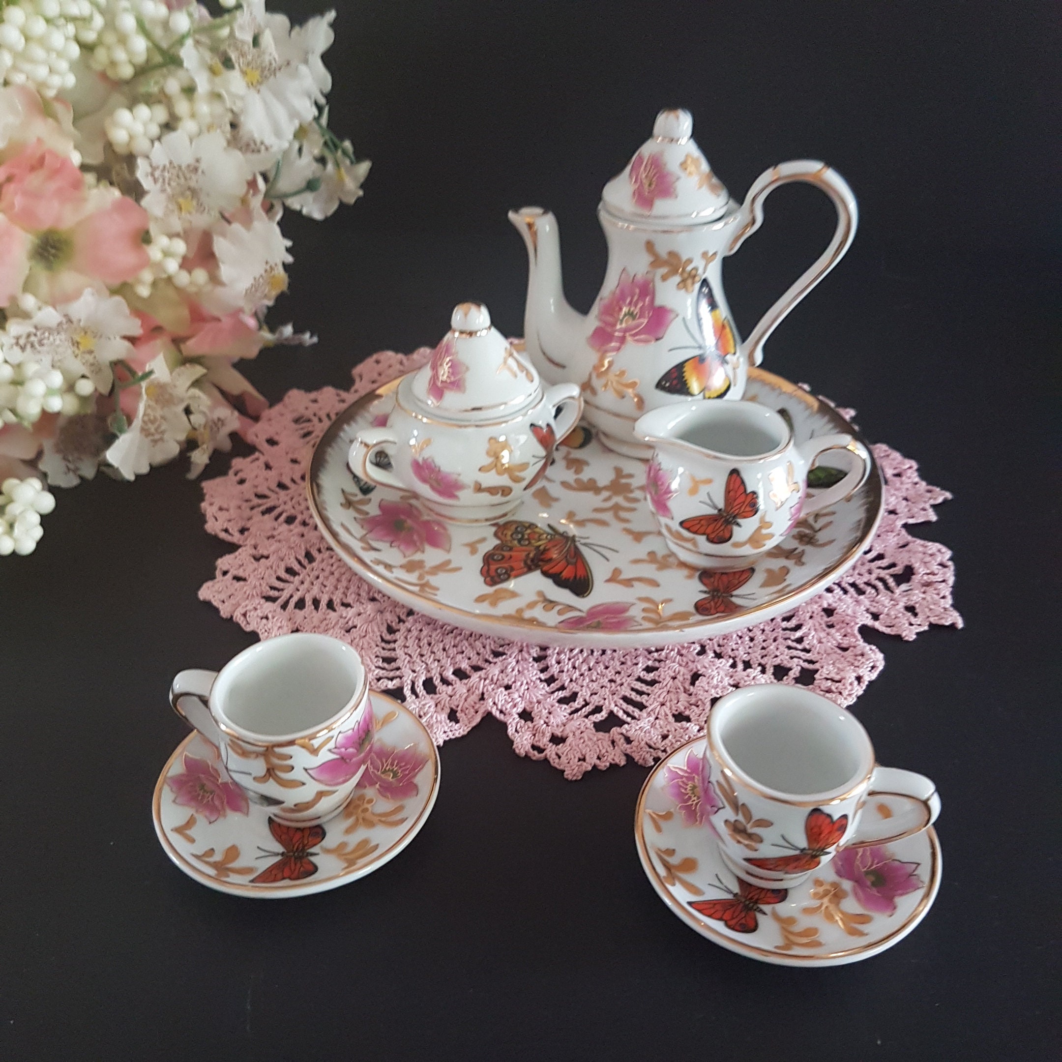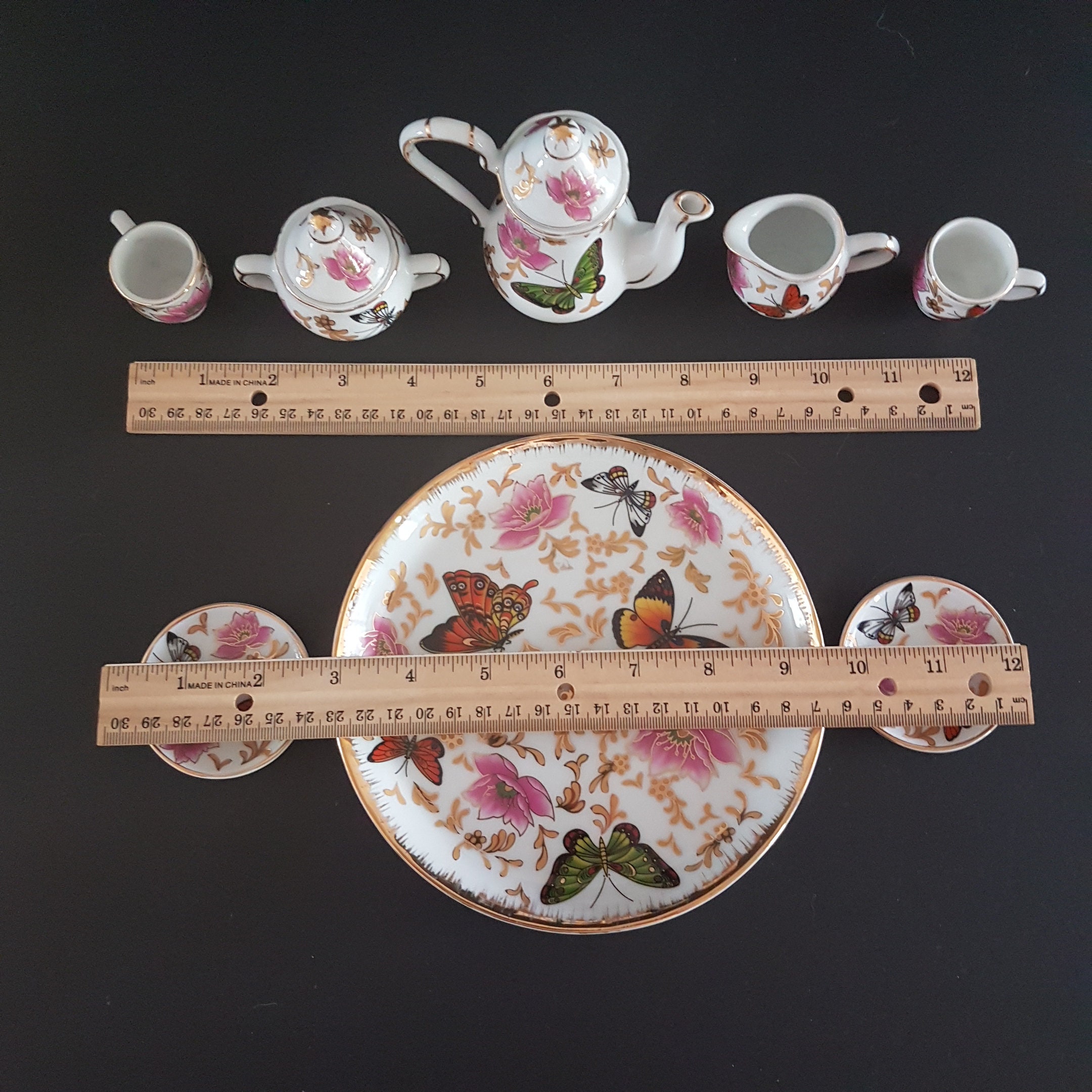 Beautiful green, orange and yellow finely detailed butterflies, big pink orchid-like flowers and lots of shimmery gold gild accents and gold trim on this BUTTERFLY miniature tea set with tray by Allison L.L.