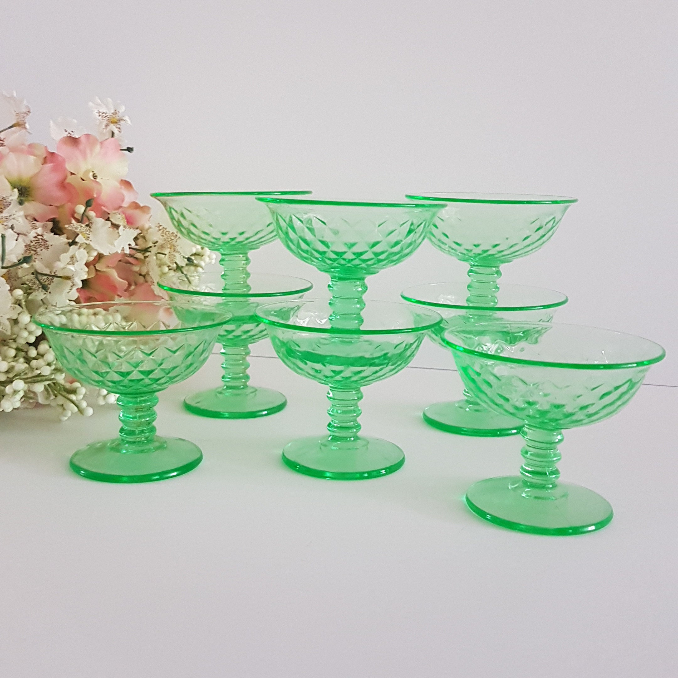 Imperial Glass Company's DIAMOND QUILTED or FLAT DIAMOND pattern coupe / champagne glass set. Also called tall sherbet glasses.