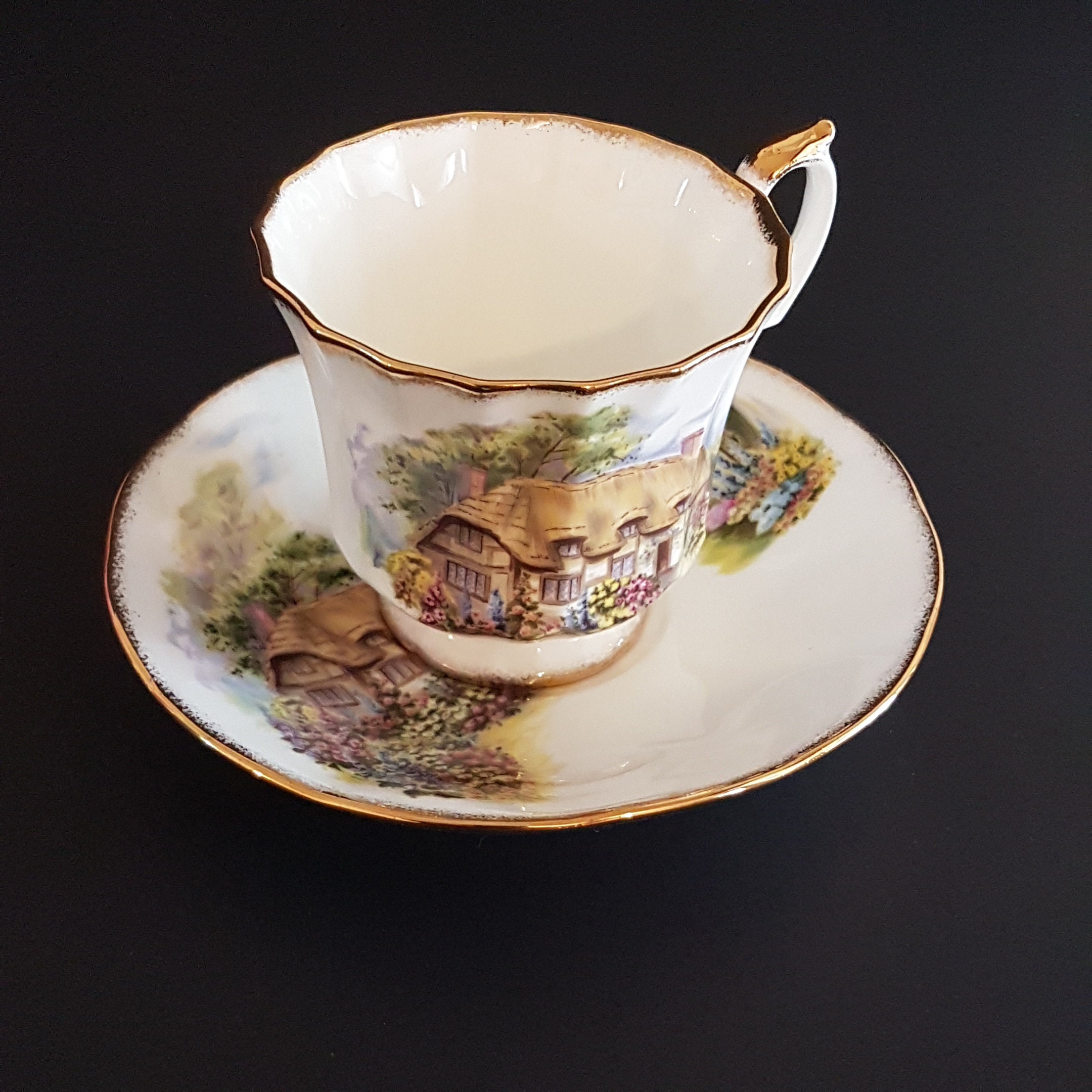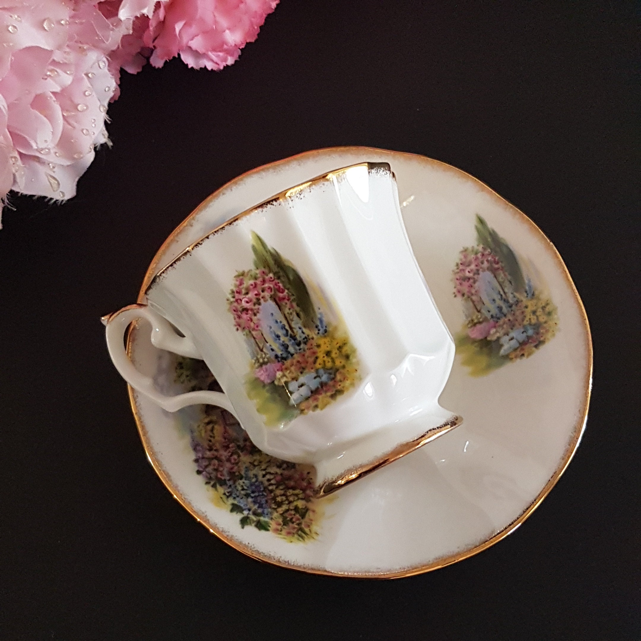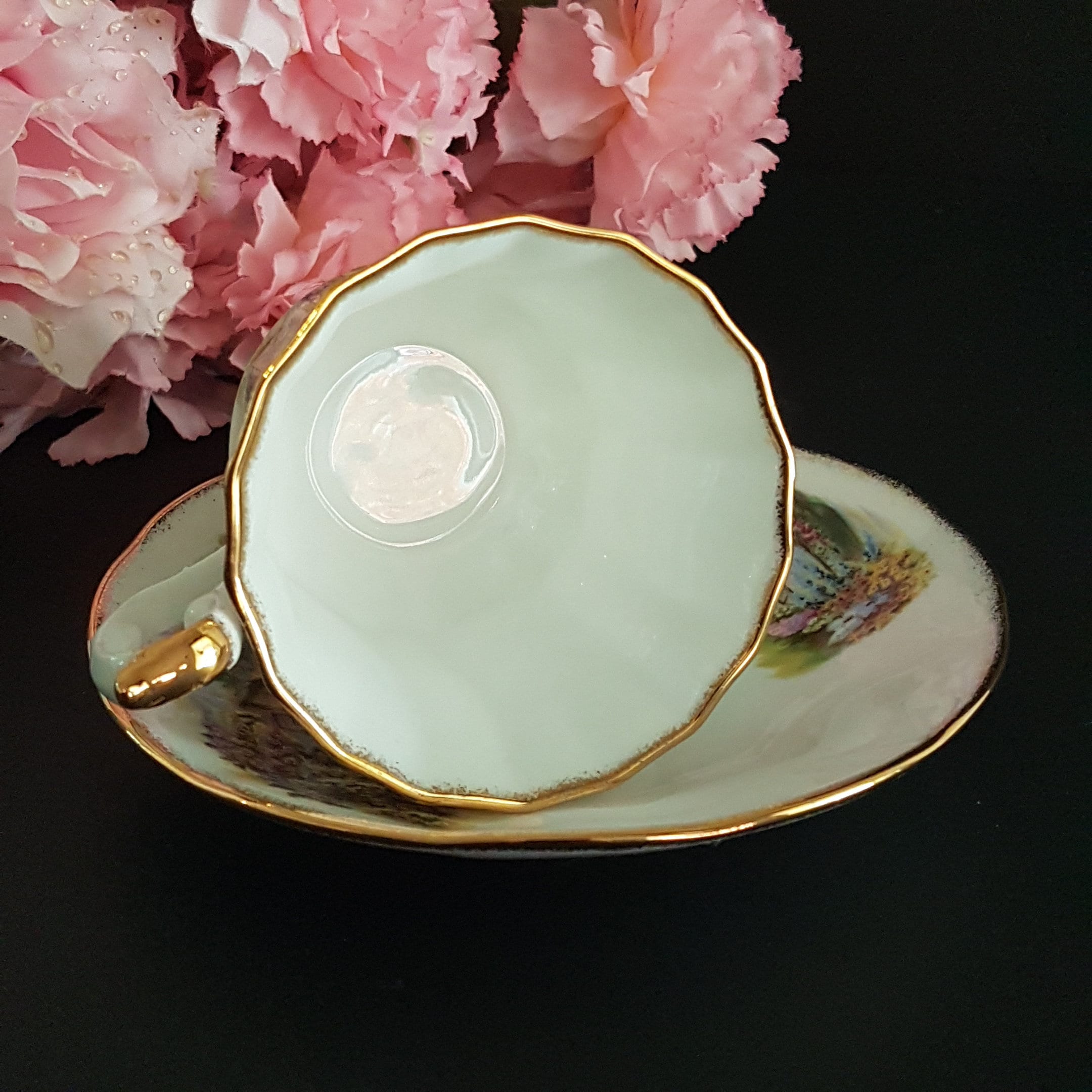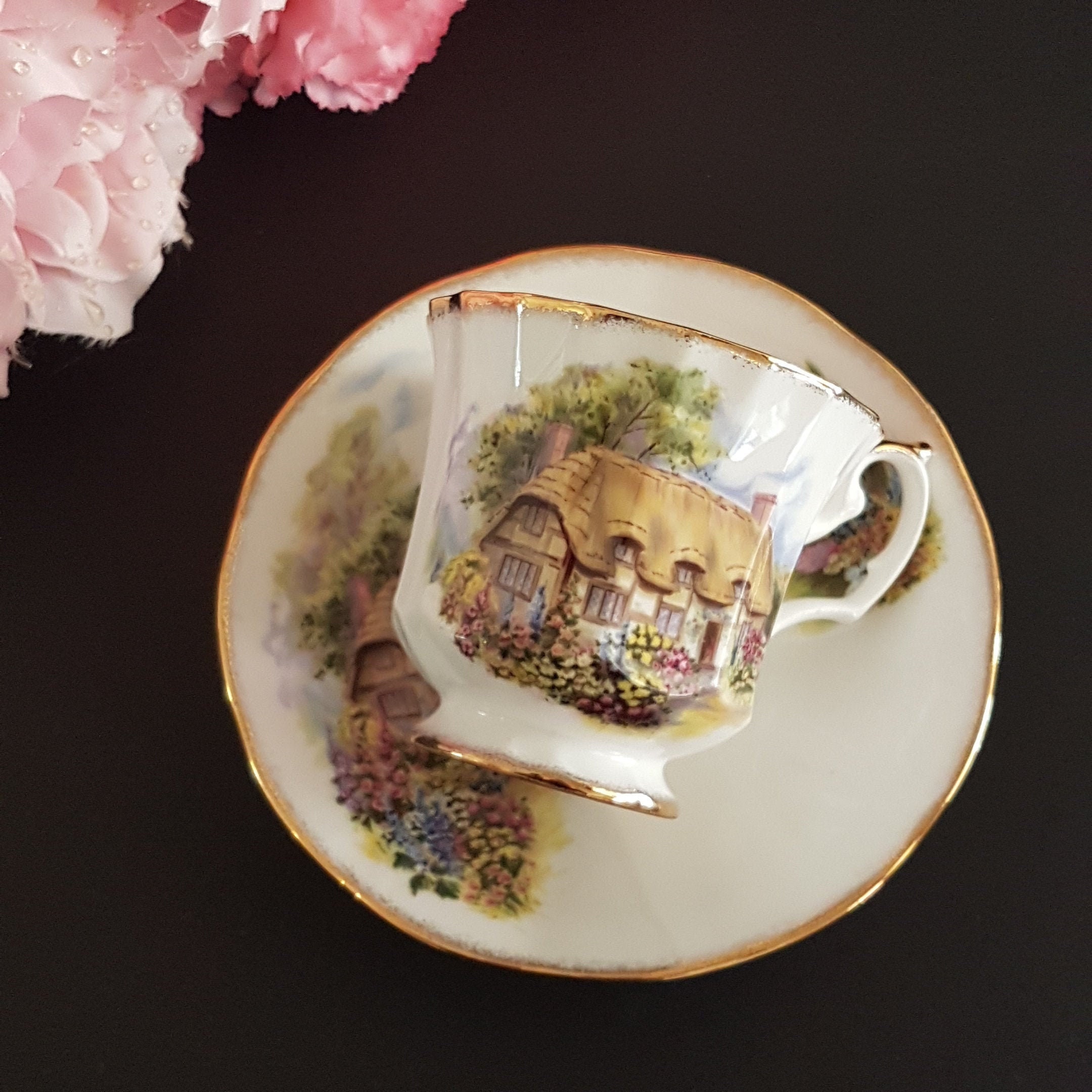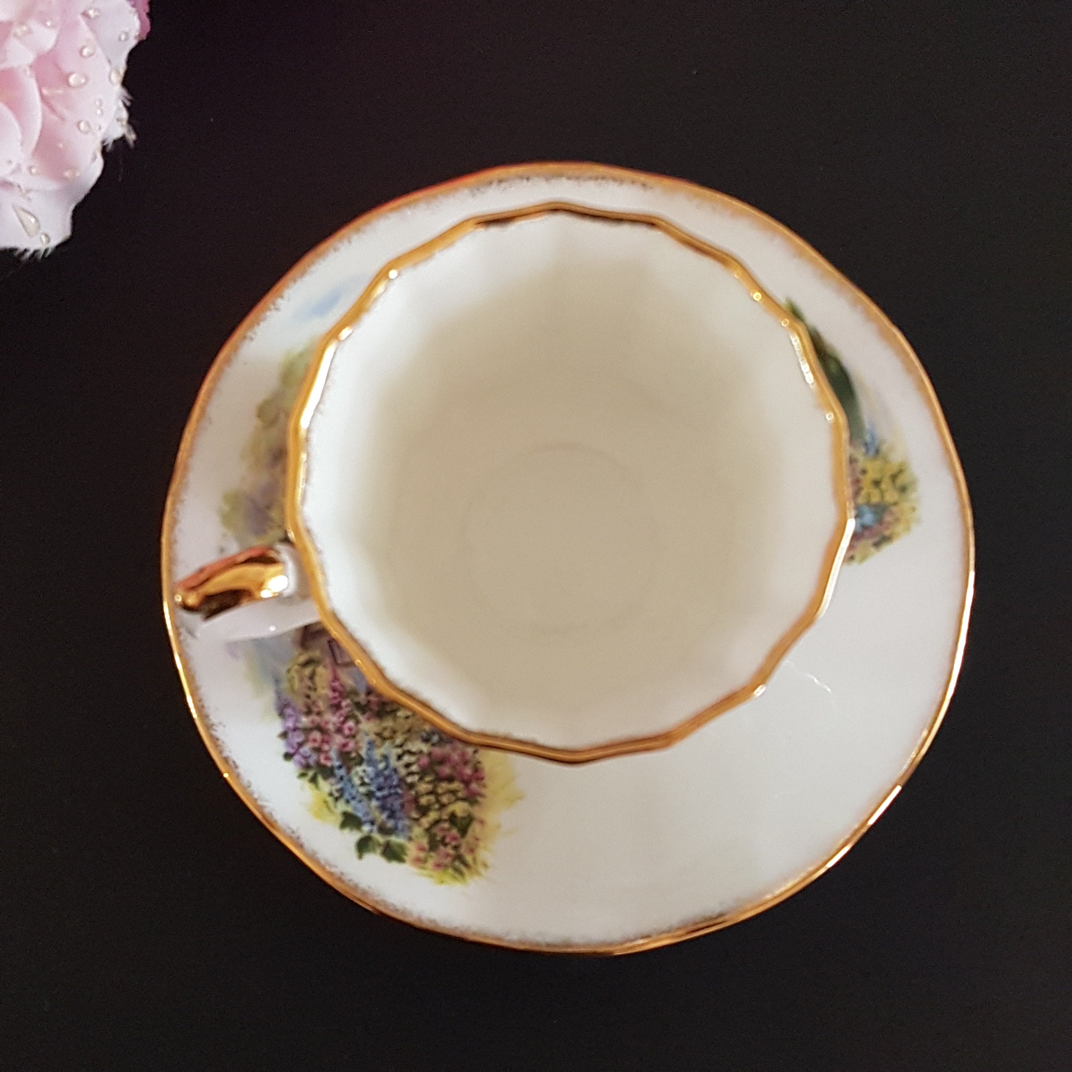 Lovely pastel colored English cottage scene with pretty cottage garden leading to the country cottage. Other side of saucer and tea cup have a smaller English garden scene. Saucer is gently scalloped with gold edge. Footed tea cup is paneled with gold edge.