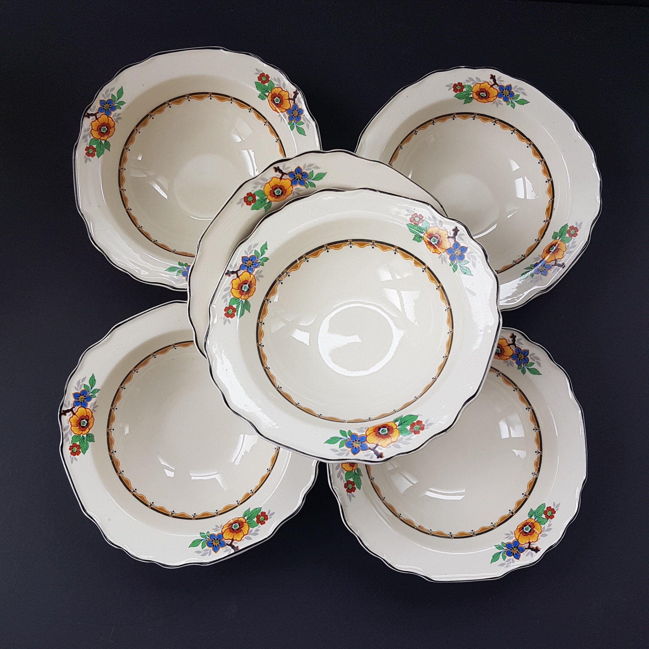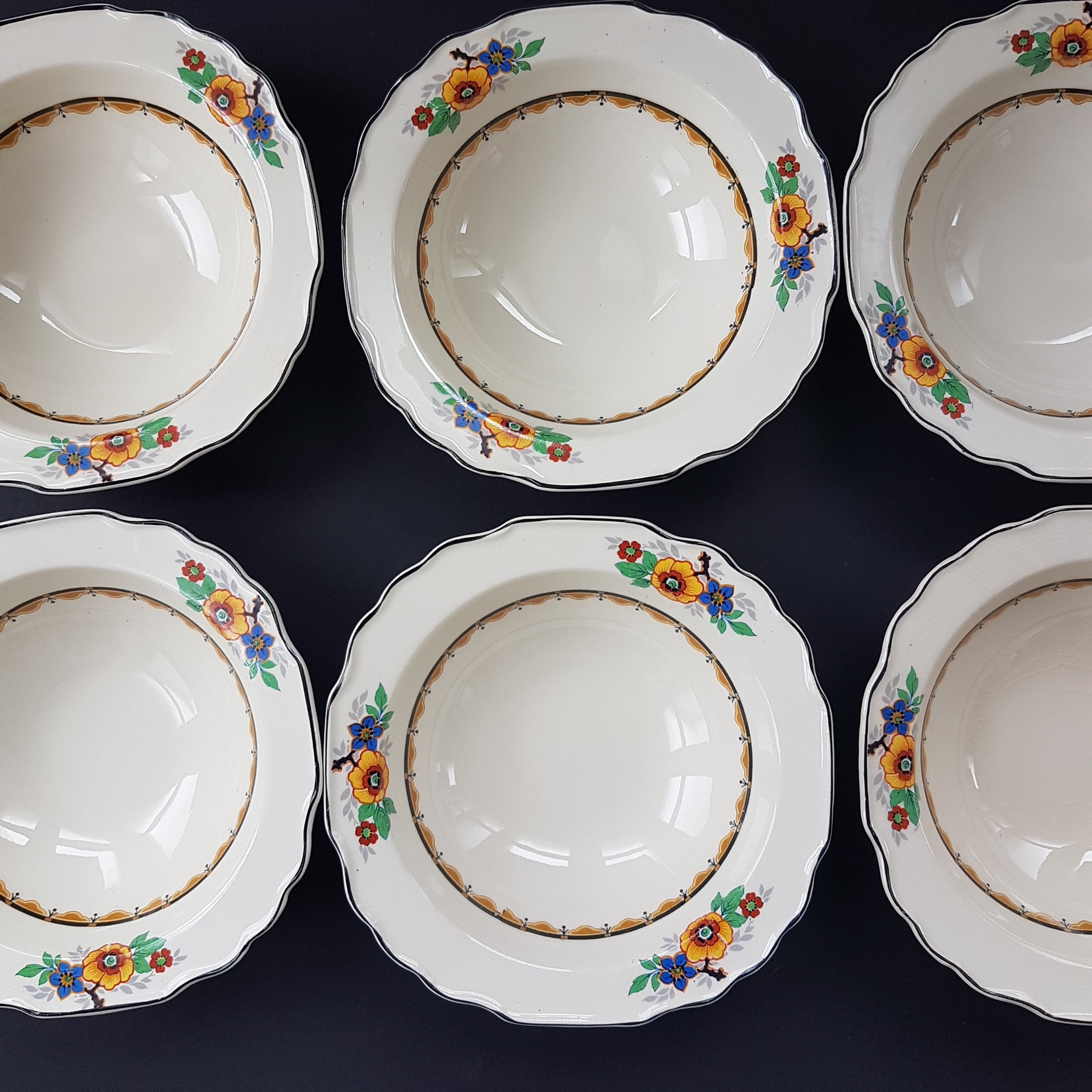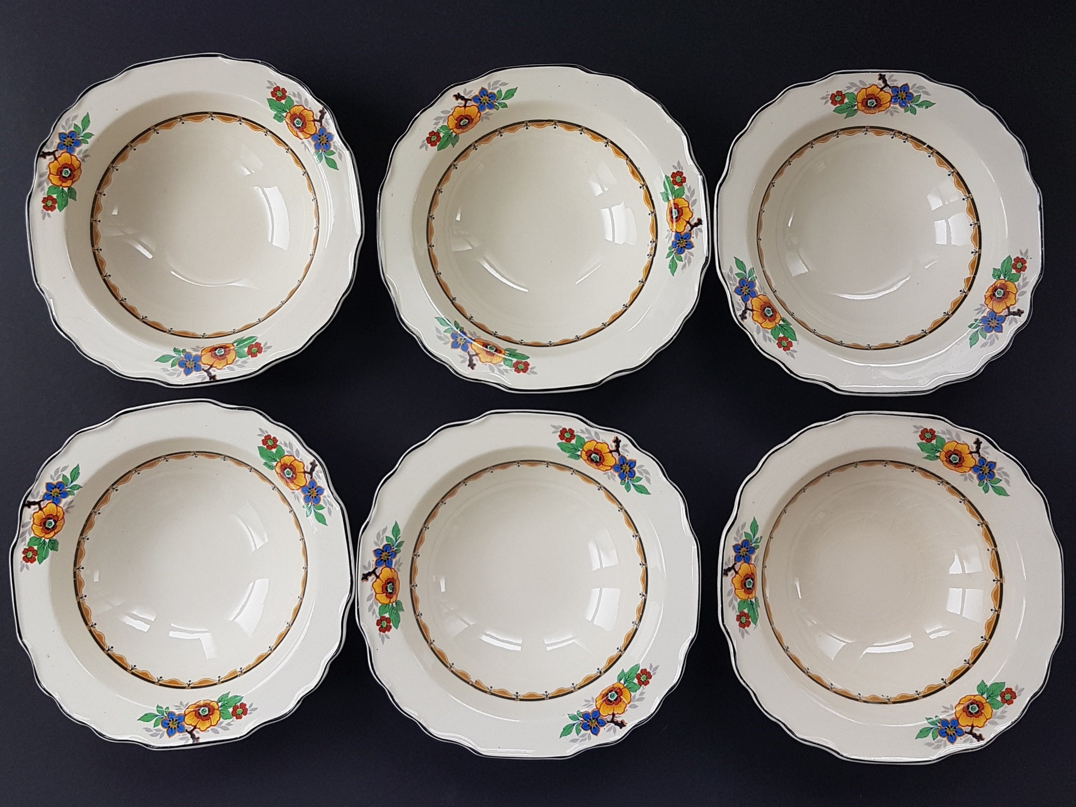 Set of 6 - Art Deco, Rimmed Soup Bowls / Cereal Bowls (1920-1949)