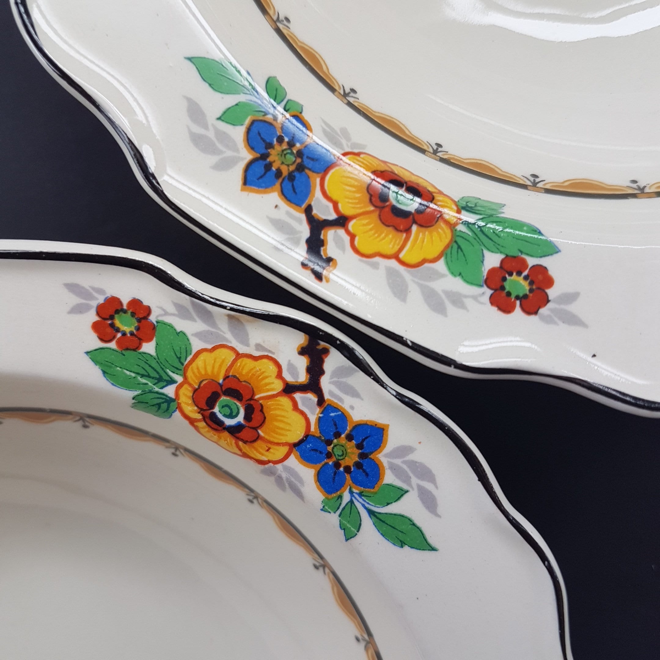 Part of Myott's Art Deco period with bold pattering of black trim, yellow and black arches, small black flowers and big yellow, blue and red flowers with grey and green leaves.