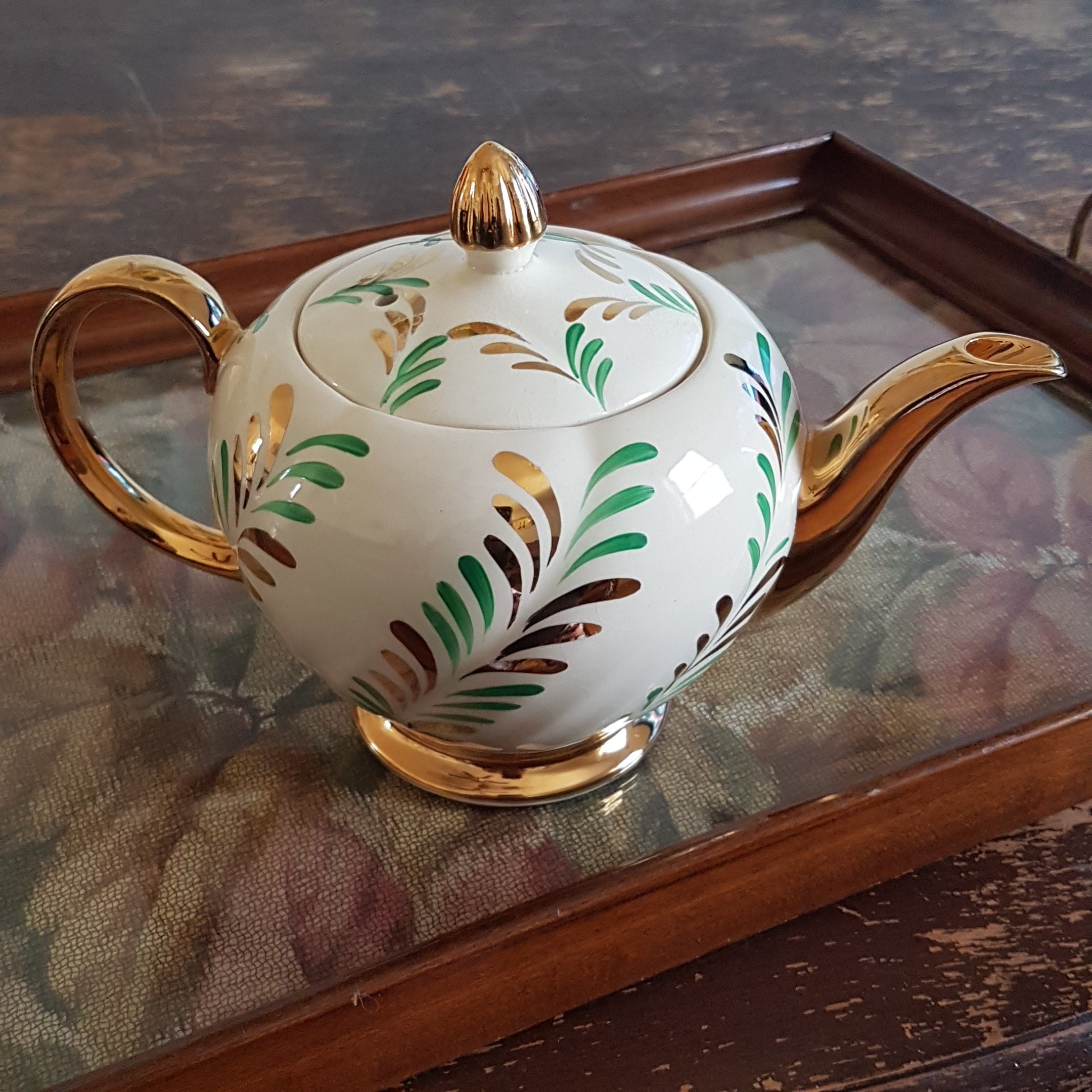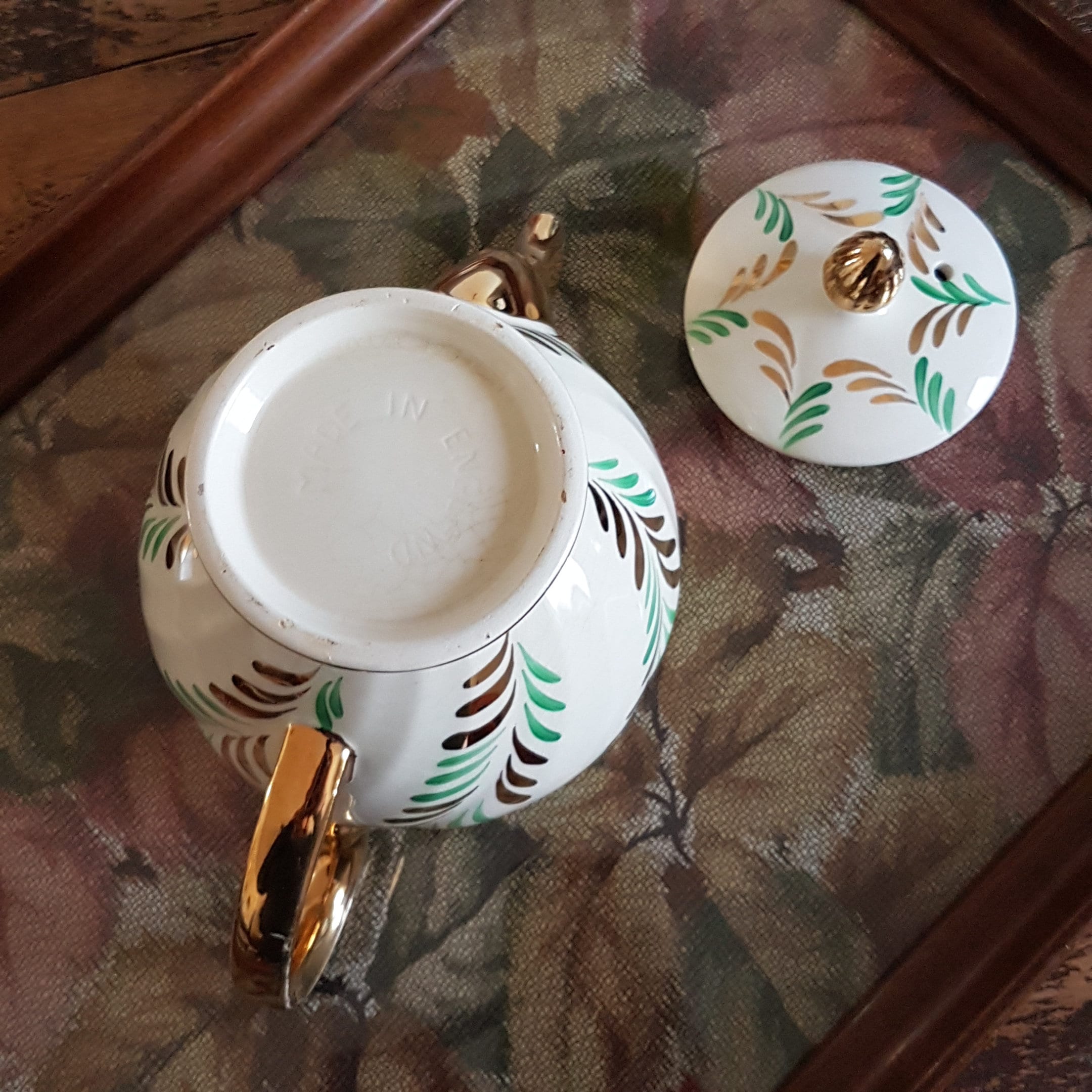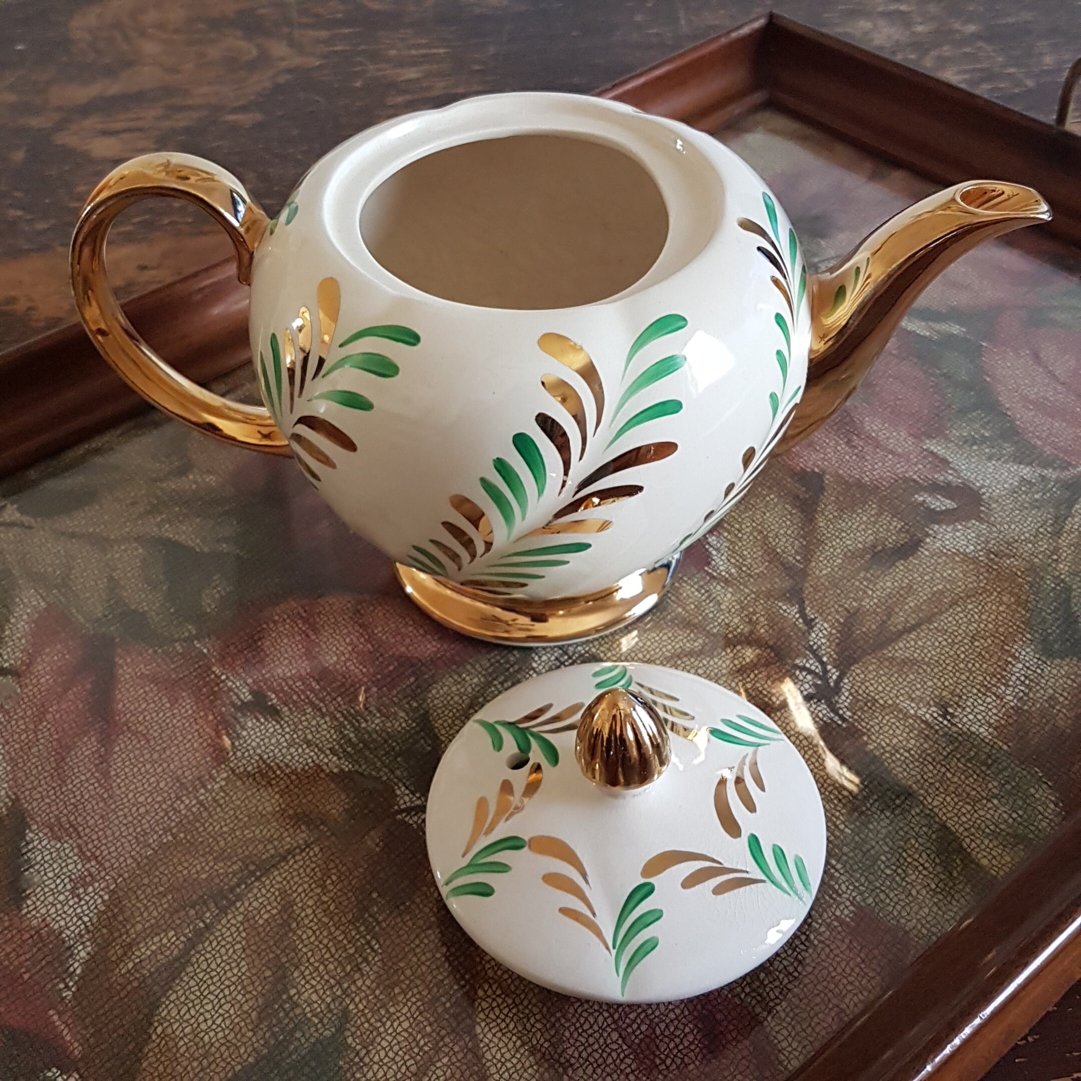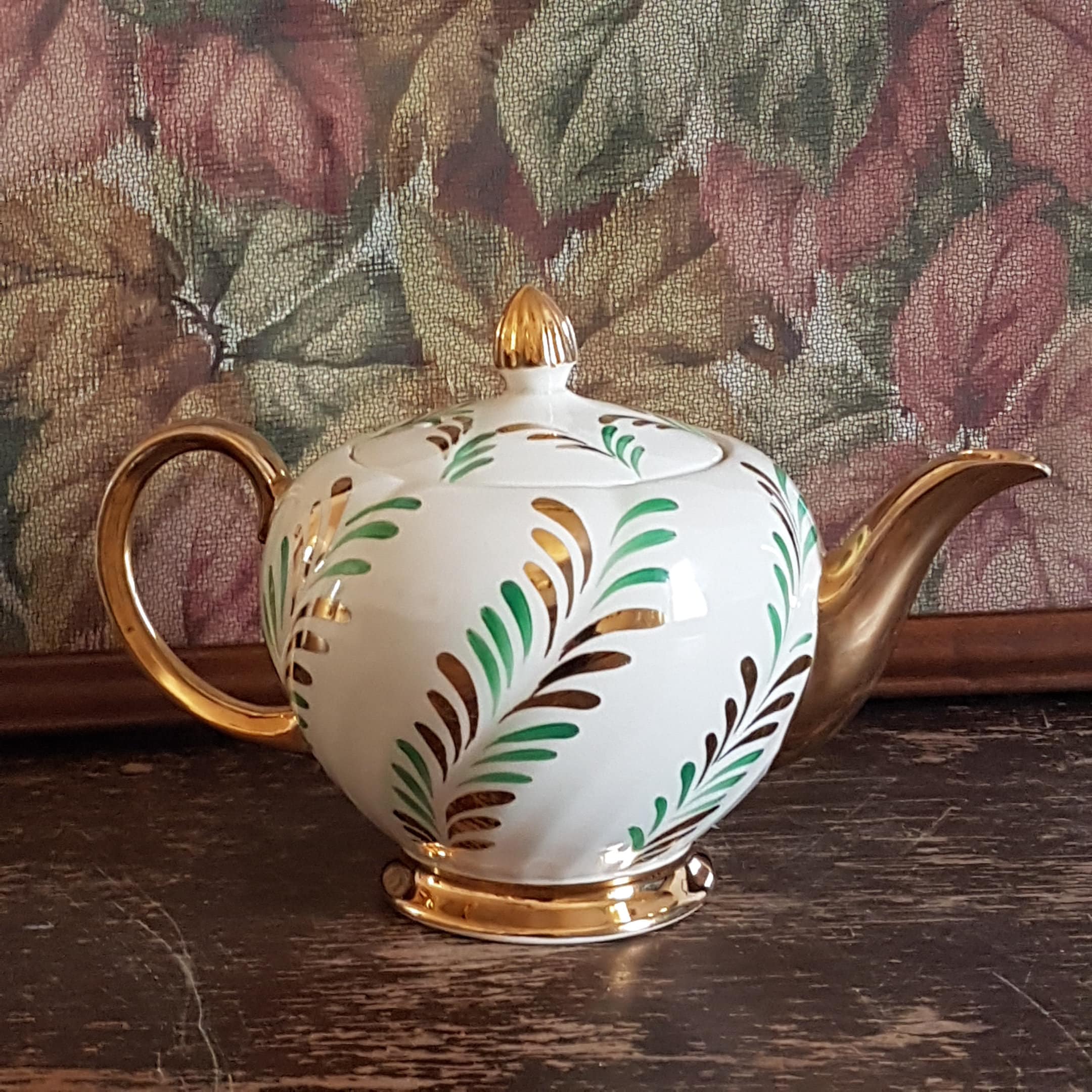 Vintage hand painted Ellgreave ironstone teapot with green & gold leaf pattern on an ivory, off-white. Lots of golden gilt with gold gild spout, base, finial and handle!
