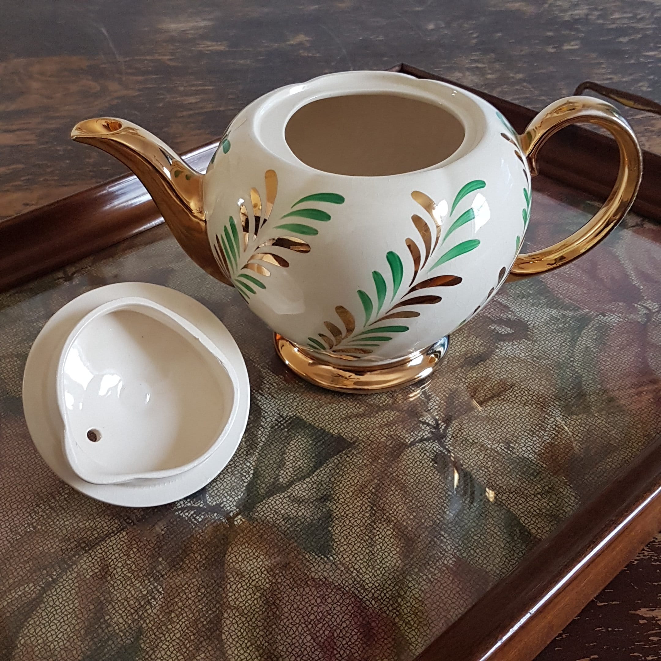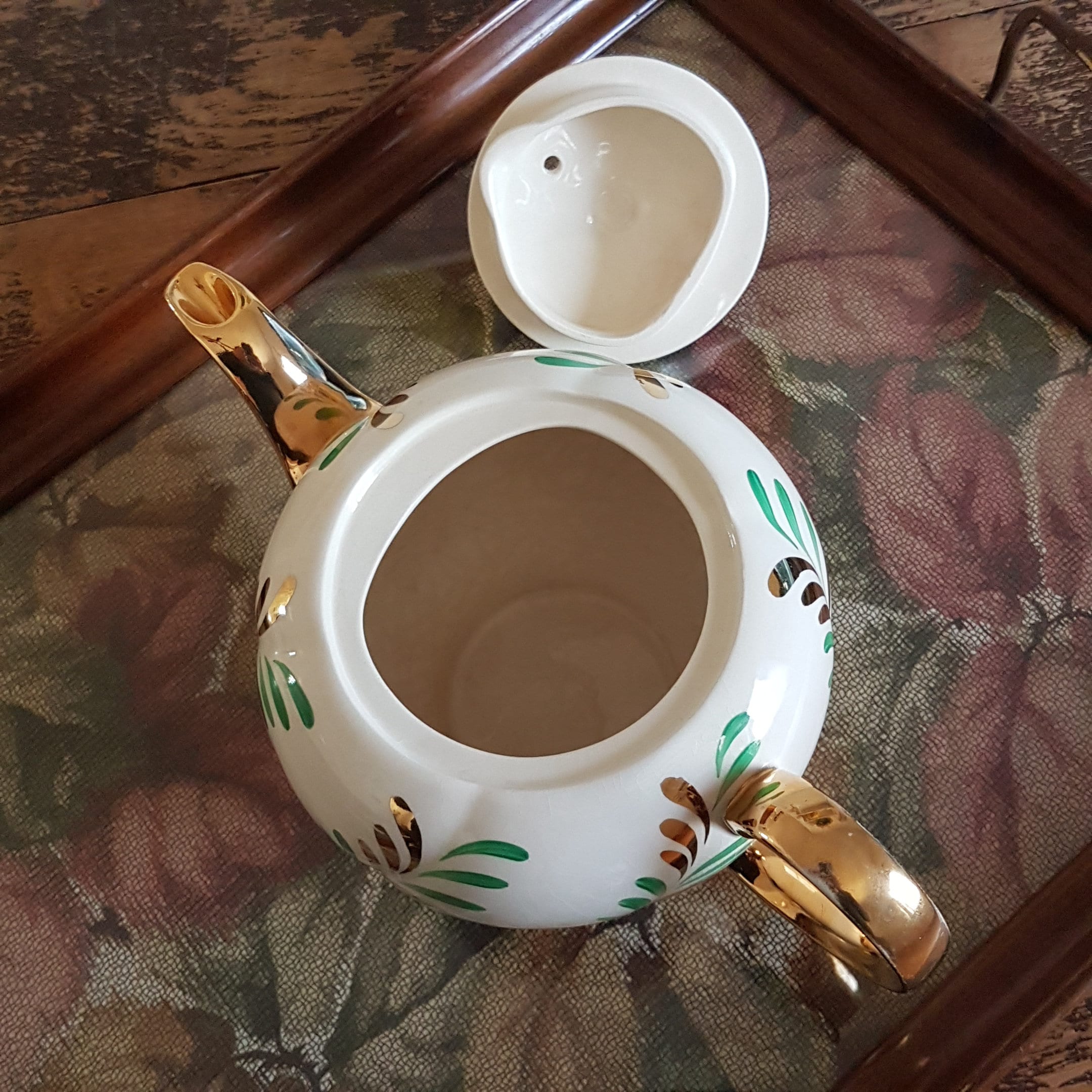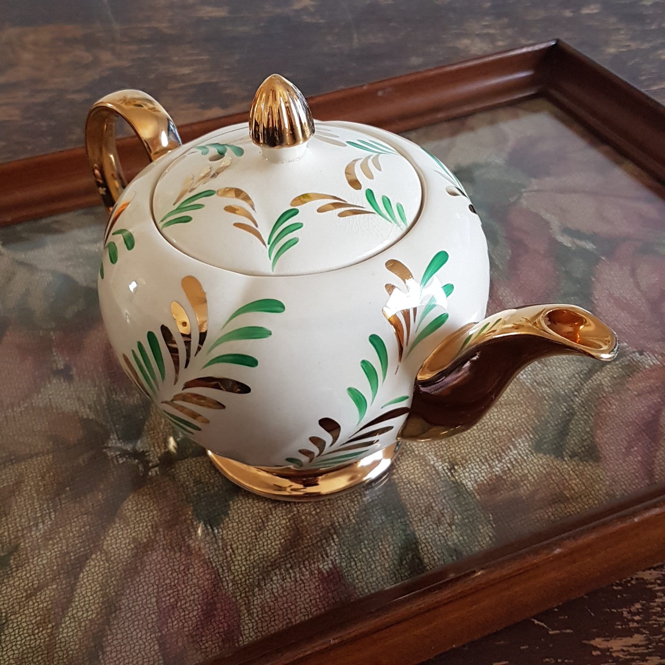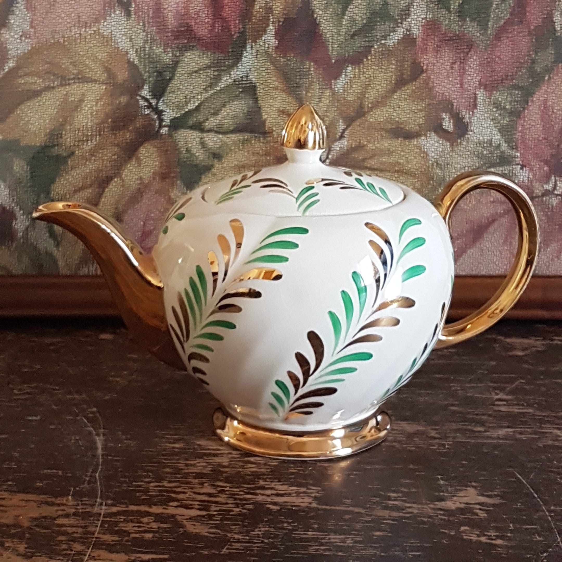 Vintage hand painted Ellgreave ironstone teapot with green & gold leaf pattern on an ivory, off-white. Lots of golden gilt with gold gild spout, base, finial and handle!