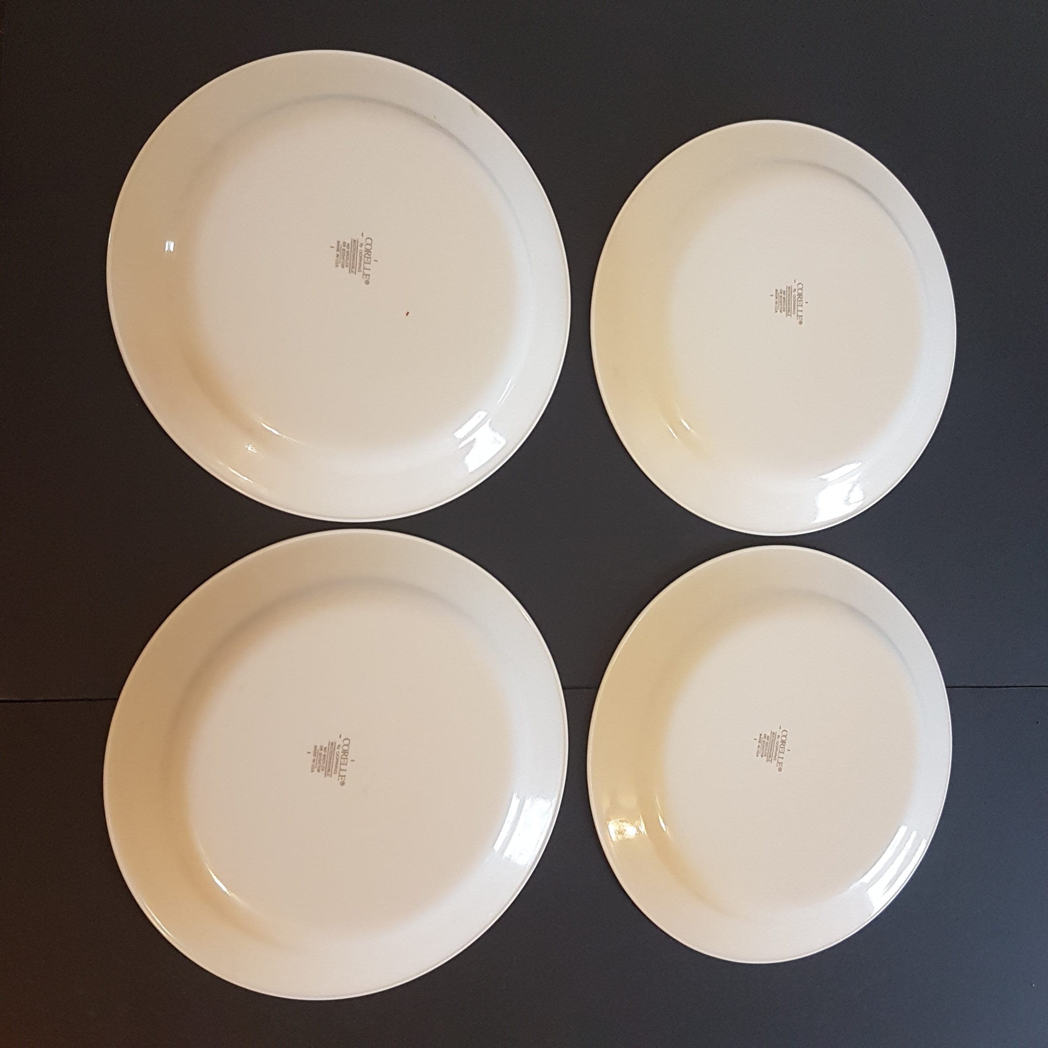 On back of plates: "Corelle by Corning - Microwavable - No Broiler or Stovetop - Made in USA"