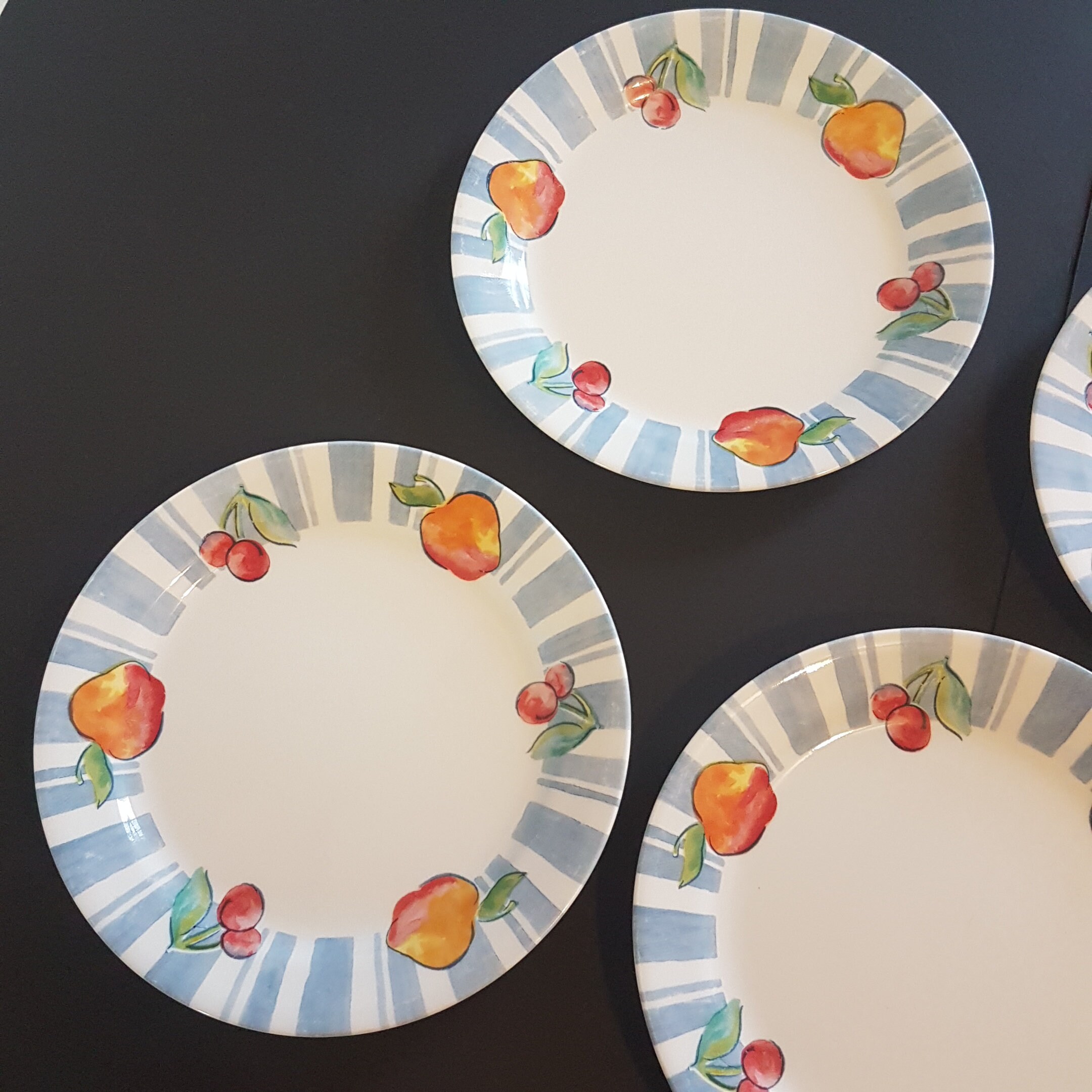 Set of 4 Corelle plates with peach / apple and cherries and a blue vertical line on rim.